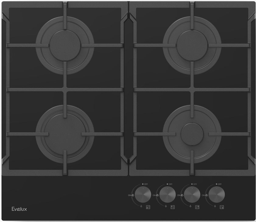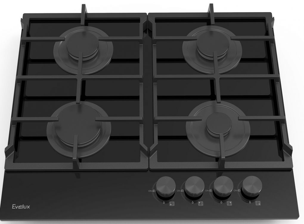 Газовые поверхности » Evelux HEG 615 BG Газовая поверхность из закалённого стекла, ширина 60 см, газ контроль, эл. поджиг, цвет - чёрный