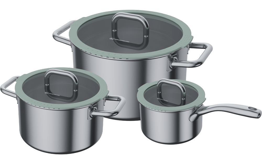В комплект входят: ковш с антипригарным керамическим покрытием на 1,8 л, кастрюли 3,4 и 5,8 л. Крышки выполнены из закаленного стекла, это позволяет следить за процессом готовки, не открывая крышку, тем самым сохраняя тепло и ароматы внутри.