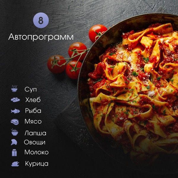 Автопрограмм всего 8, но они охватывают все основные блюда: молоко, суп, лапша, овощи, хлеб, рыба, мясо и курица. Разморозка возможна как по весу, так и по времени.