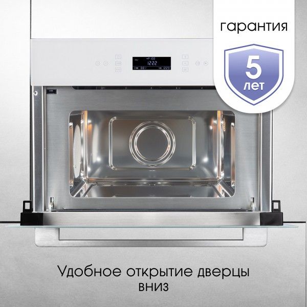 Габариты печи составляют 595x569x455 мм, а ниша для встраивания — 565x550x450 мм. Длина шнура составляет 1200 мм. Гарантия от производителя — 3 года + 2 года дополнительно.
