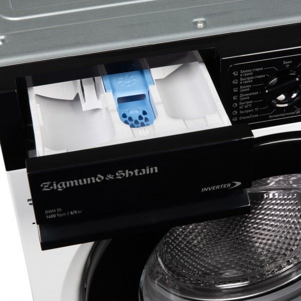 Стирально-сушильная машина Zigmund & Shtain BWM 05 станет незаменимым помощником в каждом доме благодаря качественной работе, расширенному функционалу, интуитивному управлению, необходимой индикацией и разнообразию программ под любой случай. * Инверторный двигатель: Снижает уровень шума, сглаживает колебания напряжения и практически не нагревается. Благодаря инверторному мотору эксплуатация стиральной машины станет комфортнее и безопаснее, а срок эксплуатации увеличится. * Вместимость до 8 кг: Люк диаметром в 33 см значительно облегчит процесс загрузки и извлечения белья из стиральной машины, Возможность доложить забытые вещи после начала стирки, Барабан объемом 51 л позволяет загружать до 8 килограммов сухого белья - благодаря этому вы справитесь за один цикл со всем необходимым объёмом вещей. * Темное стекло люка Black Mirror: Чёрный оттенок и глянцевая текстура прекрасно сочетаются с различными стилями дизайна, от классического до современного. Данная технология позволяет скрыть отпечатки пальцев и пятна на поверхности люка. * Удобное управление: Сенсорная панель с белым, LED-дисплеем делает управление интуитивно понятным и простым., Максимальная наглядность информации о температуре, режиме и других важных характеристиках, А также в данной модели предусмотрена Блокировка от детей и индикация стирки. * Режим “Сушка”: BWM 05 имеет 2 программы сушки и 2 комбинированные программы (стирка+сушка), Одно устройство одновременно может как удалить грязь с вещей, так и высушить их. Это позволяет тратить меньше времени и сил на то, чтобы держать вещи в порядке, В процессе сушки из тканей выдуваются пыль и шерсть, Загрузка сушки 5 кг. * 11 программ стирки: Экспресс, Быстрая 60°C, Отжим/Слив, Антиаллергенная, Полоскание, Шерсть & Шелк, Хлопок 20°C, Эко 40-60, Хлопок, Одеяла, Синтетика. Программы определяют ключевые показатели работы: температуру нагрева, продолжительность каждого действия, силу отжима, дополнительные функции. Это позволяет эффективнее удалить загрязнения и при этом сохранить первоначальный вид одежды без необходимости стирать её вручную. * Тихая работа: Скорость отжима до 1400 оборотов в минуту позволит существенно сократить время на дальнейшую сушку вашего белья! При этом уровень шума при стирке не превышает 53 дБ, при отжиме - 75 дБ, при сушке - 65 дБ, это чуть громче обычного разговора. * Повышенный уровень безопасности: Защита от перелива предотвращает повреждение машины и окружающих поверхностей в случае возникновения протечки, Контроль дисбаланса защищает стиральную машину от износа и повреждений, увеличивая срок её службы, Контроль пенообразования предотвращает поломку из-за избыточного количества пены.