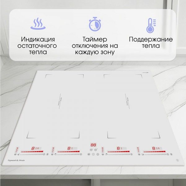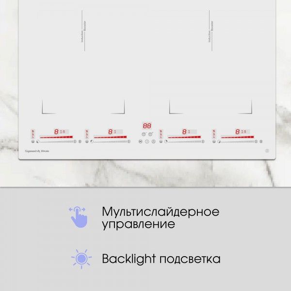 ОБЩИЕ ПАРАМЕТРЫ: • Тип поверхности: независимая индукционная стеклокерамическая • Инверторная технология нагрева • Фронтальное мультислайдерное управление • 9 уровней нагрева • Объединение двух зон в мост • Бустер на каждую зону нагрева • Таймер отключения на каждую зону, до 99 минут • Пауза • Поддержание тепла • Автоматическое определение размера посуды и адаптация мощности • Индикация остаточного тепла • Блокировка клавиатуры от детей • Автоматическая защита от перегрева, перелива, нечаянного старта • Защитное отключение при длительном использовании • Функция сопряжения Smart connect (при включении варочной панели автоматически включается и вытяжка, регулируя скорость работы в зависимости от интенсивности нагрева).