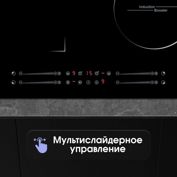 • Сенсорная панель с индивидуальным слайдером для каждой конфорки делает управление интуитивно понятным. Чтобы включить прибор и выставить нужную мощность нагрева, не нужны физические усилия. Достаточно коснуться кнопки включения и индикатора конфорки, а затем провести пальцем по слайдеру, пока на LED-дисплее не появится нужная мощность.