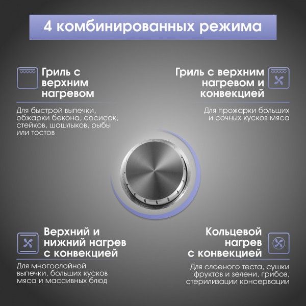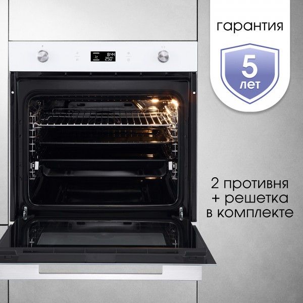 Функции: • Гриль • Разморозка • Верхний и нижний нагрев • Кольцевой нагревать с конвекцией • Верхний и нижний нагрев + конвекция • +4 комбинированных режимов Данная модель духового шкафа относится к встраиваемому типу техники, что позволяет оформить кухонный интерьер компактно, стильно и функционально. Объемные размеры духовой камеры предназначены для приготовления блюд на большую семью. Дверца имеет три стекла, обеспечивающих безопасность для пользователя: при работе внешняя часть остается холодной и минимизирует риск обжечься. Также стёкла можно легко снять, чтобы упростить процесс поддержания техники в чистоте. Материал внутренней части духовой камеры сделан из эмали легкой очистки без пор, в которых могли бы застрять капли жира или остатки пищи. Тангенциальное охлаждение осуществляет встроенный мощный вентилятор, который создает воздушный барьер вокруг духовки и сохраняет кухонный гарнитур в безопасности от высоких температур внутри камеры духового шкафа. Доводчик на дверце духовки заботится о тихом и аккуратном пользовании, снижая вибрацию на корпус духовки и кухонный гарнитур. Дверца автоматически закроется до конца самостоятельно плавно и мягко. Телескопические направляющие позволяют выдвинуть противень за пределы духового шкафа, что позволяет удобнее и проще загрузить блюдо в духовку или вытащить его. Управление с помощью утапливаемых переключателей в сочетании с электронным программатором и сенсорной настройкой времени – отличное сочетание для лёгкого пользования. Благодаря индикаторам на дисплее легко контролировать процесс приготовления. При открытии дверцы в камере духового шкафа автоматически загорится свет для удобной загрузке блюда. В комплекте есть решетка и два противня: плоский и глубокий. Духовой шкаф Zigmund Shtain E 171 W – новое поколение духовых шкафов, созданных для комфортного, быстрого и лёгкого приготовления любимых блюд на современном уровне.